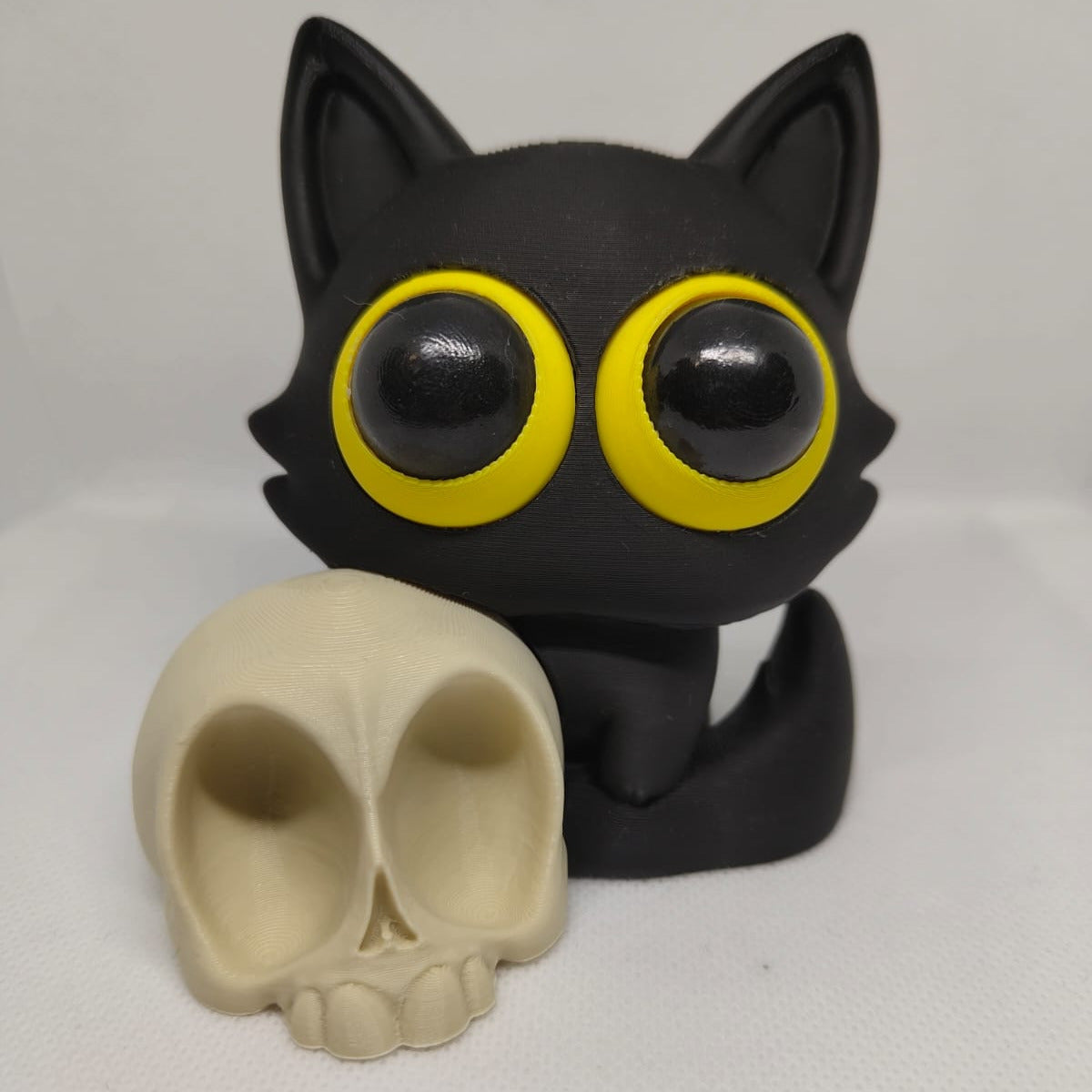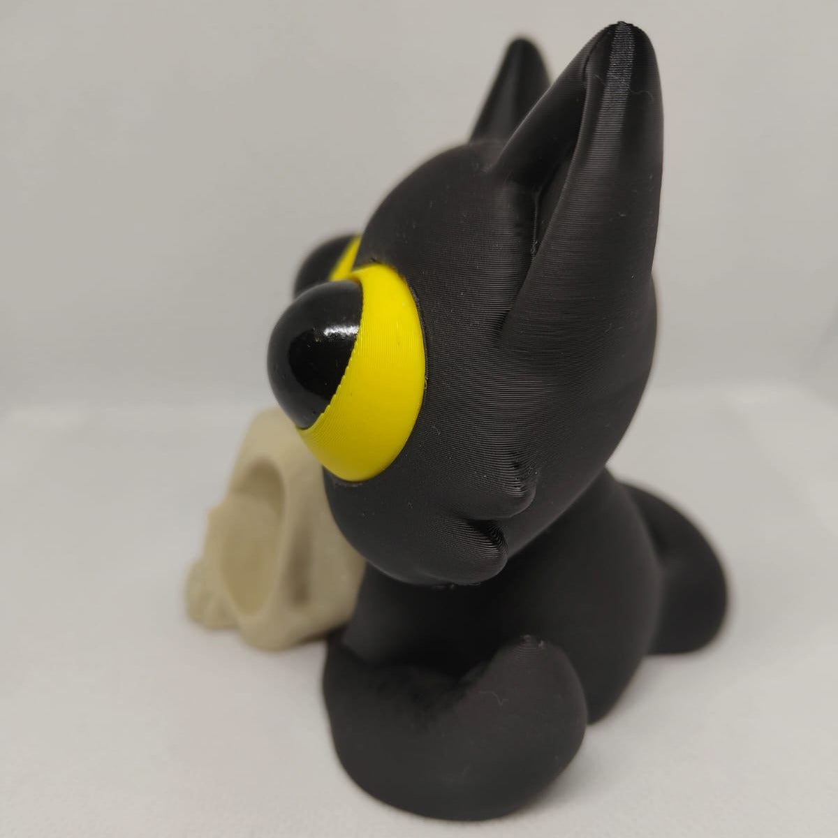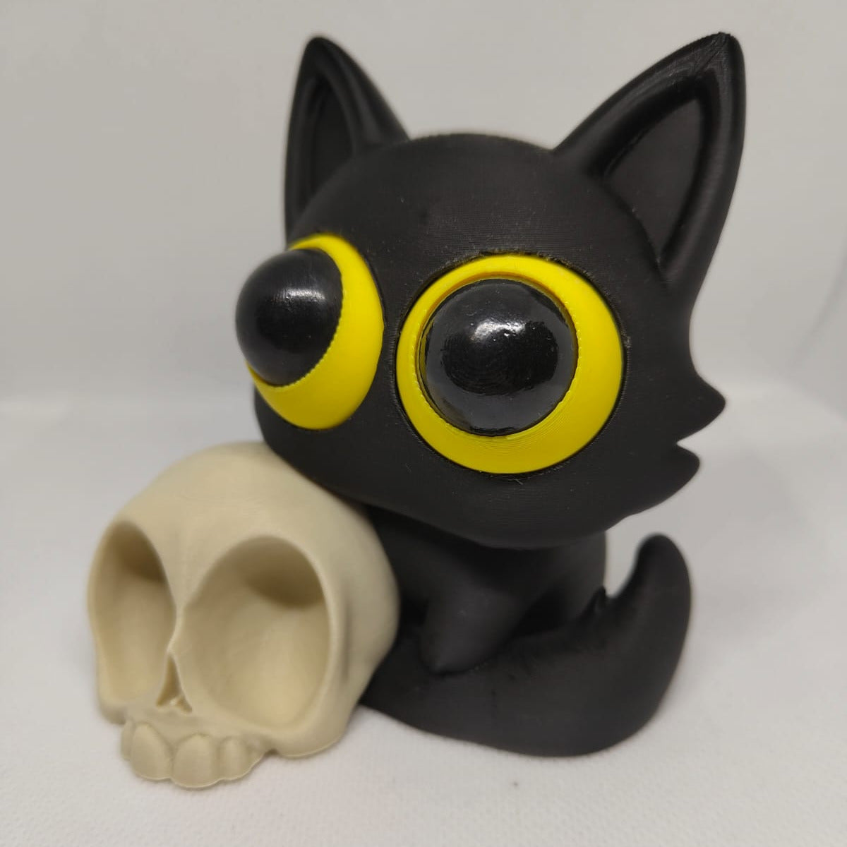 - Design exclusivo que combina o clássico gato preto com uma caveira decorativa.
